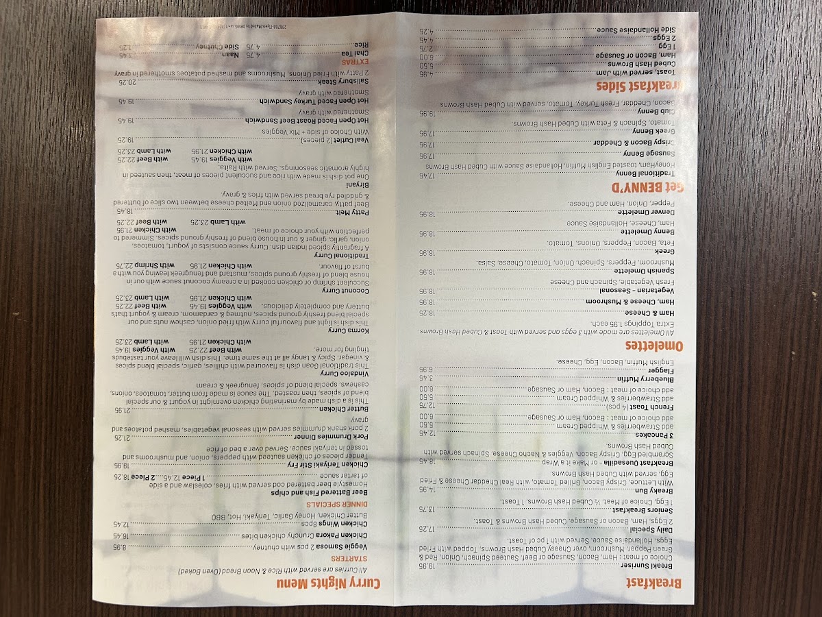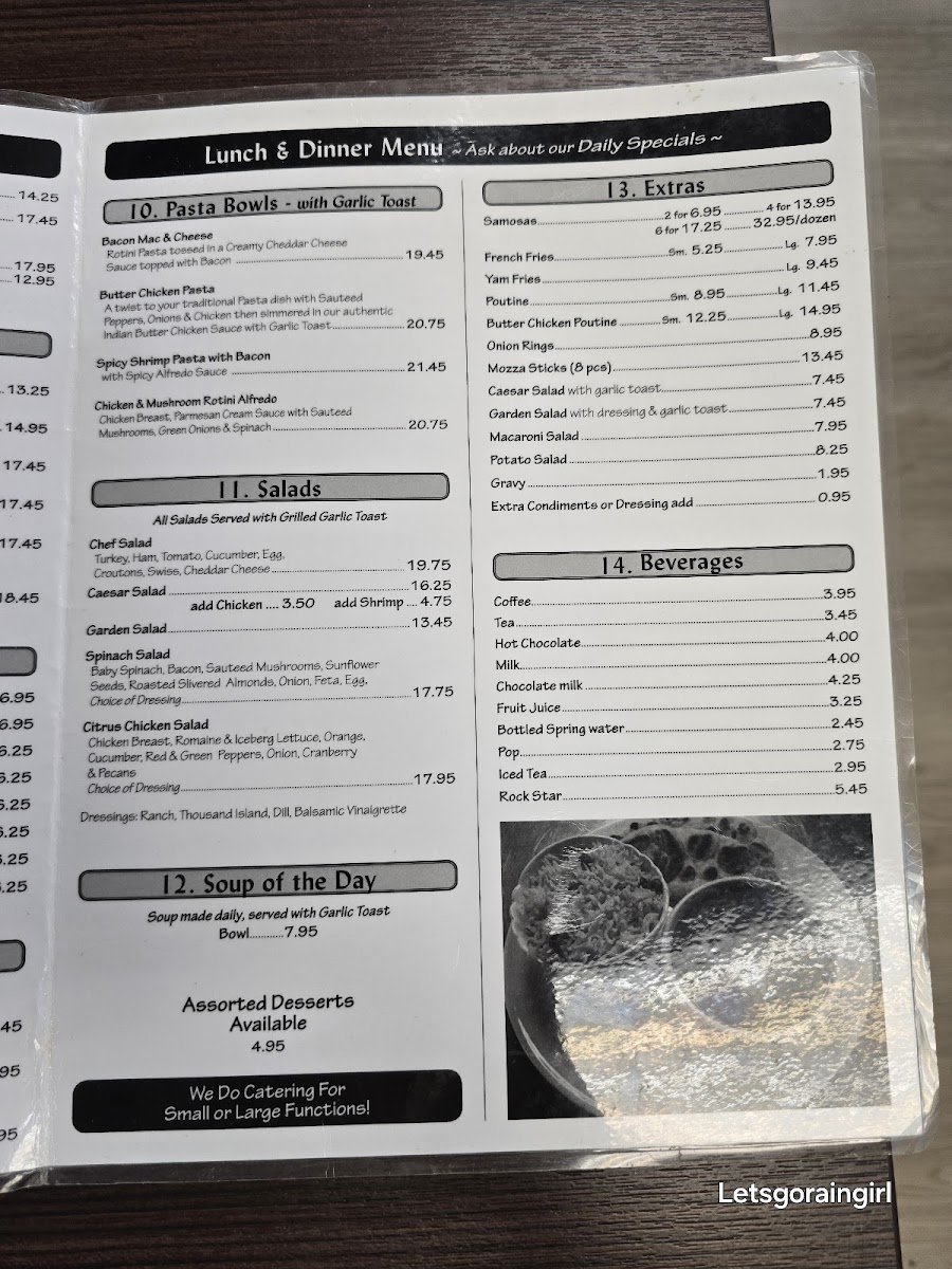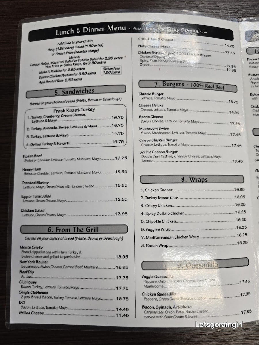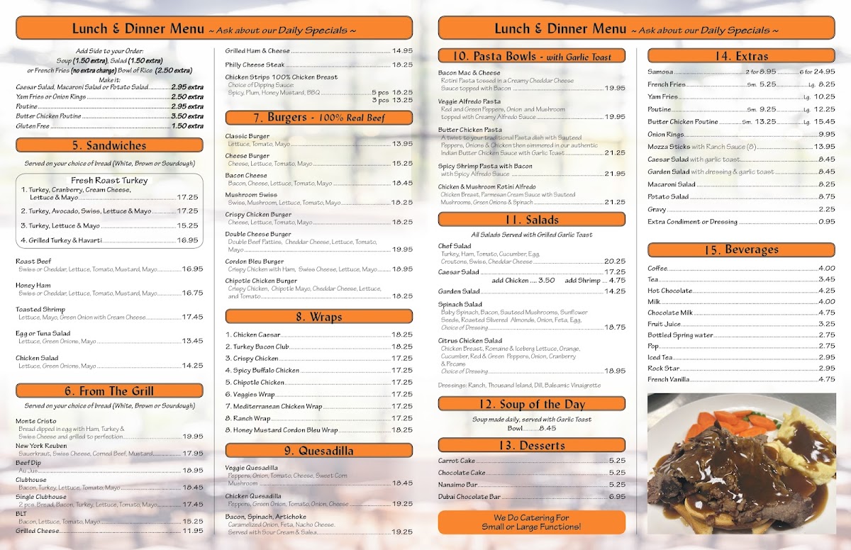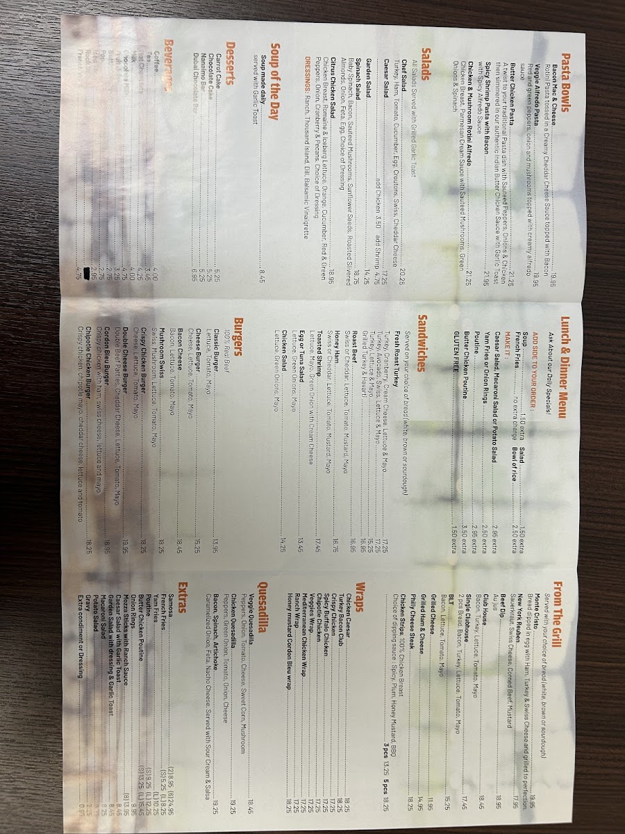 This menu is suited for casual dining, lunch breaks, or light meals. Guests may choose from hearty meals or lighter fare, making it appropriate for both quick orders and relaxed dining experiences.